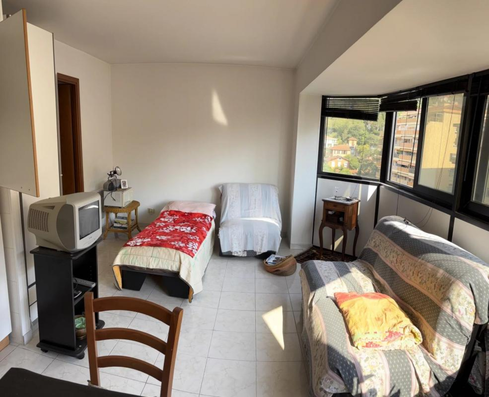 Appartement lumineux avec de grandes fenêtres et vue dégagée sur les montagnes.
